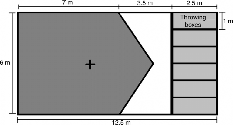 This is the layout of a typical Boccia court.  Usually it will be marked with lines like a badminton court.